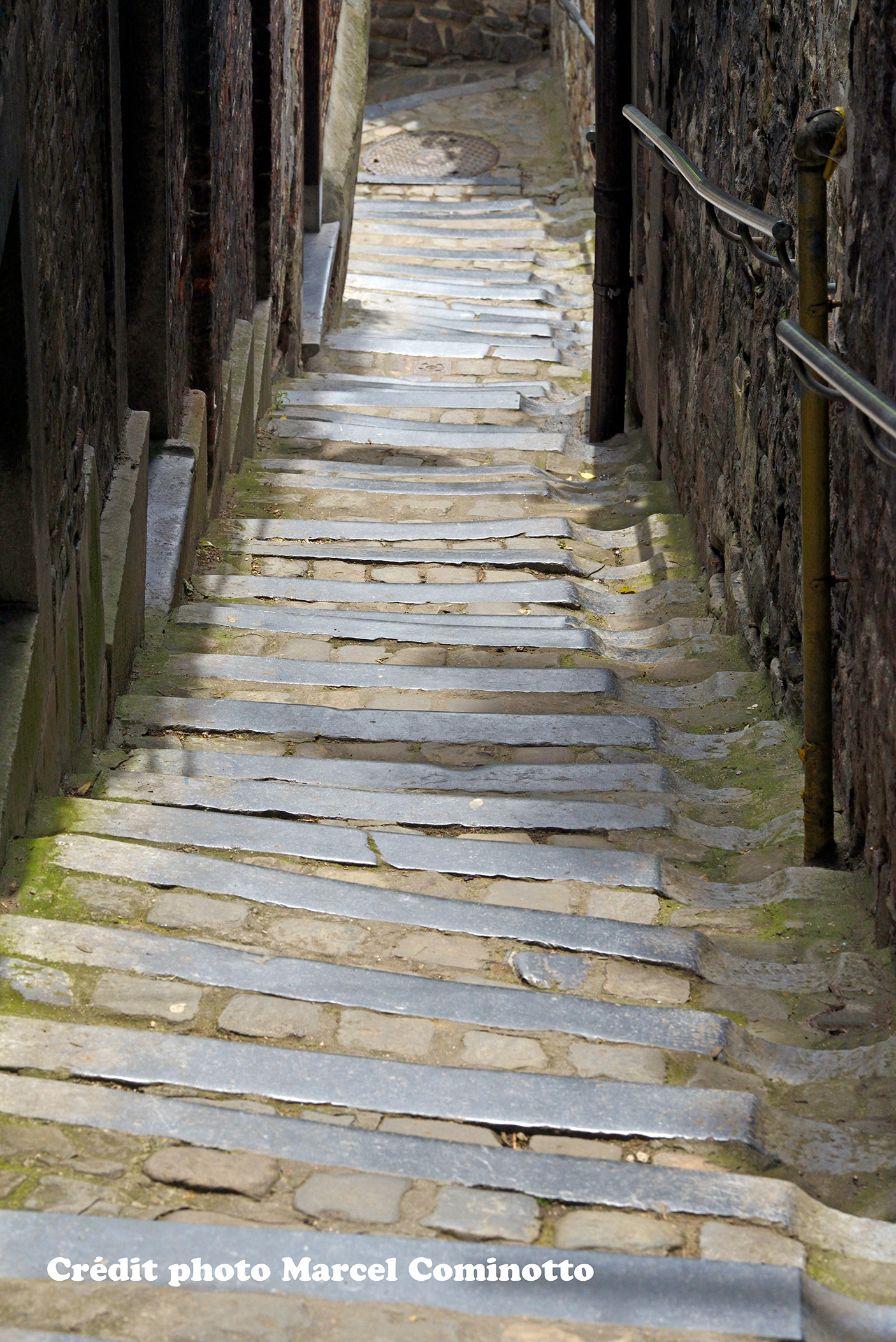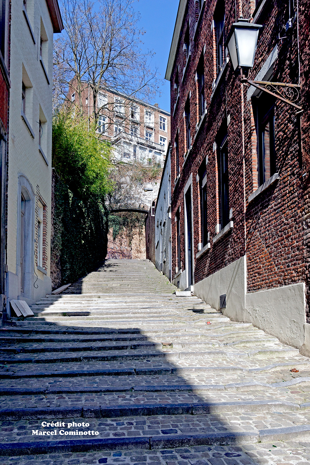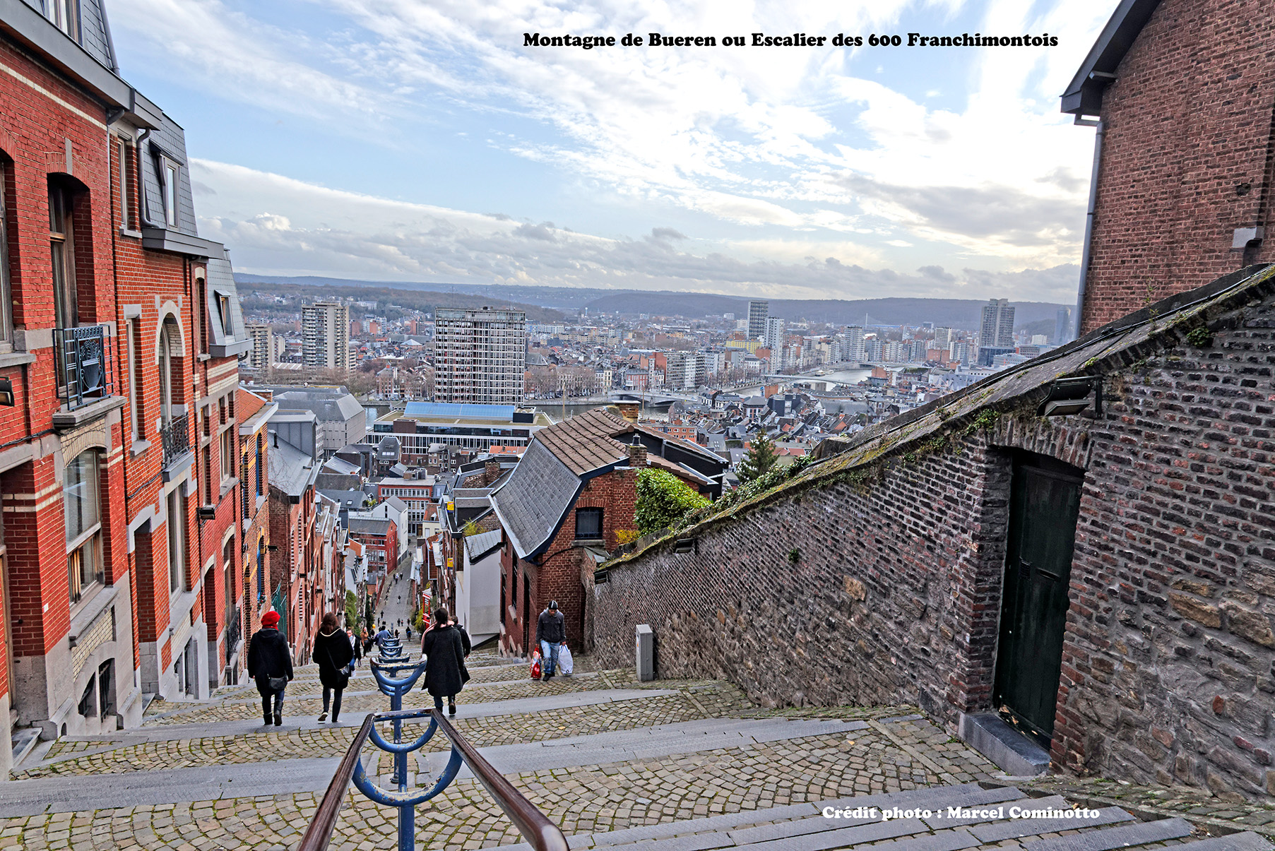 Après une pause déjeuner bien méritée, qui nous a permis de nous réchauffer, et d’apprécier de succulents « boulets sauce Lapin », nous avons repris notre balade vers la Place St Lambert, le Perron, l’Hôtel de ville, pour arriver au pied des escaliers de Bueren, plus impressionnants en vrai qu’à la télévision.